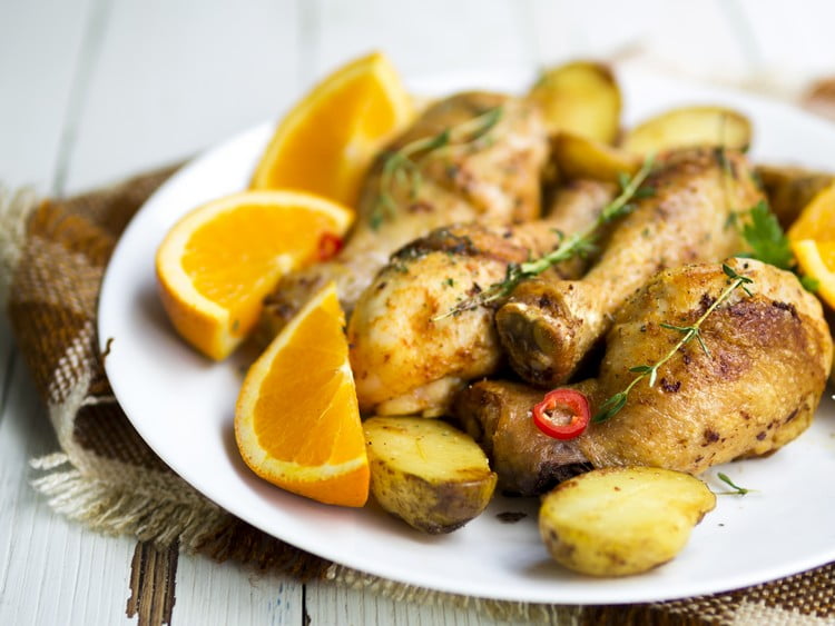 É muito comum pensar em macarrão e já associar com frango assado, não é mesmo? Mas se você não quer algo tão elaborado e demorado de fazer, eu sugiro assar apenas as coxas do frango, ainda mais se finalizar com suco de laranja, onde o cítrico da laranja fixa na carne, deixa suculenta e muito saborosa.